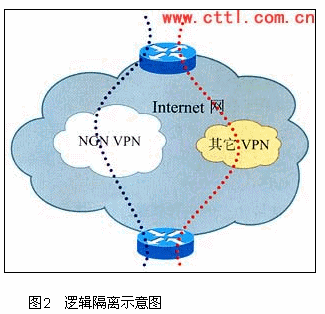 從圖2可以看出,邏輯隔離是在現(xiàn)有的運(yùn)營商數(shù)據(jù)網(wǎng)基礎(chǔ)上,利用已經(jīng)比較成熟的VPN(如MPLSVPN)技術(shù)將網(wǎng)絡(luò)資源進(jìn)行隔離:將網(wǎng)絡(luò)劃分為兩個邏輯子網(wǎng),一個是Internet業(yè)務(wù)子網(wǎng),另一個是NGN業(yè)務(wù)子網(wǎng)。兩個子網(wǎng)通過VPN進(jìn)行隔離。NGN業(yè)務(wù)與Internet業(yè)務(wù)的區(qū)分在邊緣路由器PE上完成,PE根據(jù)物理接口或邏輯接口區(qū)分業(yè)務(wù)的類型,邏輯接口可以是VLAN,PVC等。在NGN子網(wǎng)中,再有針對的對QoS以及安全等問題進(jìn)行解決。