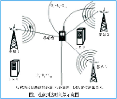 觀察到達(dá)時(shí)間差(OTDOA)是通過測(cè)量電波從發(fā)射機(jī)傳播到多個(gè)接收機(jī)的傳播時(shí)間差來確定目標(biāo)移動(dòng)臺(tái)的位置。初步測(cè)量通過UE接收的下行鏈路公共導(dǎo)頻信道的到達(dá)時(shí)間差實(shí)現(xiàn)。3個(gè)基站形成的平面上,一點(diǎn)到兩個(gè)固定點(diǎn)的距離差如為定值時(shí),該點(diǎn)必定在一條雙曲線上,兩條這樣的雙曲線的交點(diǎn)便可得到移動(dòng)臺(tái)的位置,如圖1