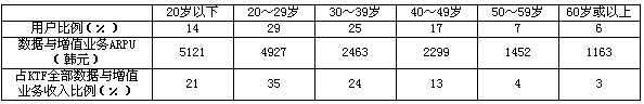 表4 KTF各年齡用戶群數(shù)據(jù)與增值業(yè)務(wù)消費能力對比(2004年1~9月)