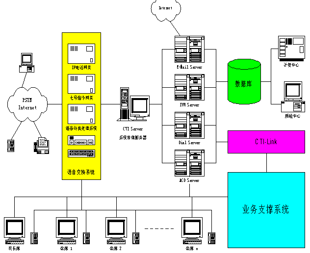 如實(shí)施例圖2、所示,其CTI系統(tǒng)主要包括:IP電話接口(1),信令接口(2),語(yǔ)音傳真接口(3),語(yǔ)音交換機(jī)(4),系統(tǒng)管理服務(wù)器(6),電子郵件服務(wù)器(7),交互式語(yǔ)音管理服務(wù)器(8),撥號(hào)服務(wù)器(9),用于平均分配話務(wù)的語(yǔ)音系統(tǒng)分配服務(wù)器(10),數(shù)據(jù)庫(kù)(12),連接于數(shù)據(jù)庫(kù)的計(jì)費(fèi)中心(13)和數(shù)據(jù)采編中心(14),CTI業(yè)務(wù)接口(15),業(yè)務(wù)支撐系統(tǒng)(16),以及連接于業(yè)務(wù)支撐系統(tǒng)(16)和語(yǔ)音交換機(jī)(4)的若干坐席終端(5、11)。