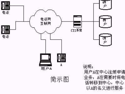 該業(yè)務(wù)方法涉及一種用戶電話轉(zhuǎn)移到CTI(Computer Telephony Integration)語(yǔ)音服務(wù)系統(tǒng)的接續(xù)服務(wù)方法,其CTI系統(tǒng)通過(guò)接口連接于公用電話網(wǎng),用戶在CTI系統(tǒng)登記,選擇服務(wù)功能,相關(guān)信息存入數(shù)據(jù)庫(kù),用戶電話設(shè)置轉(zhuǎn)移;當(dāng)客戶呼叫已轉(zhuǎn)移用戶電話時(shí),自動(dòng)接入CTI語(yǔ)音系統(tǒng),請(qǐng)求相關(guān)信息,對(duì)信息進(jìn)行分析判斷、處理,查詢數(shù)據(jù)庫(kù)用戶信息,以用戶名義進(jìn)行接續(xù)服務(wù)。其完全避免了傳統(tǒng)CTI系統(tǒng)的專用特服號(hào)碼服務(wù)的弊端,充分利用了交換機(jī)的功能,以用戶的電話號(hào)碼為客戶提供語(yǔ)音、傳真、數(shù)據(jù)及人工接續(xù)服務(wù)。