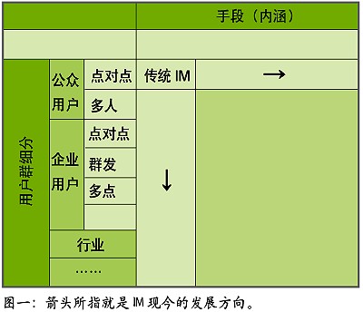 IT行業(yè)發(fā)展數(shù)十年,有一個(gè)共識(shí),或是一種經(jīng)驗(yàn)結(jié)論,大約是:在用“老工具解決新問(wèn)題”、“老工具解決老問(wèn)題”、“新工具解決老問(wèn)題”、“新工具解決新問(wèn)題”四者中,一般最先者最善,也極討巧,最后者則最為事倍功半。觀IM發(fā)展趨勢(shì),似乎介于“新工具解決老問(wèn)題”、“新工具解決新問(wèn)題”二者之間,就體現(xiàn)在表中兩個(gè)箭頭上,是以錢景堪憂。