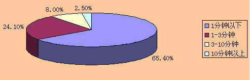 “彩話”業(yè)務(wù)主要應(yīng)用是主叫方為了通話中的和諧溝通而設(shè)置的,因此它與通話時(shí)長具有正相關(guān)性,一般短暫的工作式或通知式的通話無須主叫方設(shè)置背景音效。根據(jù)信息產(chǎn)業(yè)部提供的《電信資費(fèi)聽證會(huì)資料》,國家統(tǒng)計(jì)局對(duì)全國24個(gè)大、中、小城市電話用戶通話時(shí)長進(jìn)行了調(diào)查,調(diào)查結(jié)果見圖1所示。