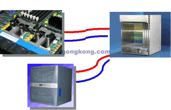 散熱原理: 由工業(yè)空調(diào)提供冷卻循環(huán)水,板卡上的“熱點”安裝液體散熱片,散熱片通過循環(huán)管道以及特殊連接器與背板連接,背板上由特殊連接器通過循環(huán)管道與工業(yè)空調(diào)的循環(huán)系統(tǒng)相連。板卡可以正常插拔,不會牽連循環(huán)管道。