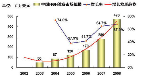 對于中國NGN市場規(guī)模的預測,主要取決于各個運營商在NGN方面的戰(zhàn)略發(fā)展重點,以及重點的投資方向?傮w上來說,從2003年起,以IPTV、VOIP、寬帶接入等業(yè)務為代表的NGN的部分業(yè)務的推廣,使得事實上中國已經(jīng)形成一定的NGN的市場規(guī)模,盡管這一市場規(guī)模仍然很小。2004年中國的NGN基礎設備的市場規(guī)模超過8千萬美元,以后隨著各個運營商NGN戰(zhàn)略的進一步清晰,這一部分的投資會保持持續(xù)穩(wěn)定的增長,2005~2008年以后的NGN設備投資規(guī)模的平均增長率可以達到50%。