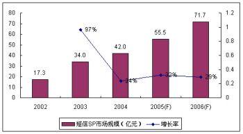 繼2004年中國政府和運營商監(jiān)管力度的加大,2005年的短信SP市場規(guī)模增長率為32%,SP市場規(guī)模55.5億元,比2004年略有上升;谀壳岸绦攀袌鲈隽渴袌龅目s小,其增長主要依靠對存量市場需求的深度挖掘。諾盛預(yù)計2006年的短信市場繼續(xù)保持平穩(wěn)的增長勢頭,增長率將達29%。
