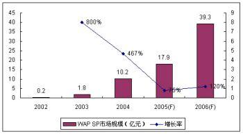2005年中國運營商對WAP沉默用戶的清理和一系列內(nèi)容監(jiān)管措施使得WAP市場前兩年的高速增長勢頭減緩,SP市場規(guī)模增長率下探至75%,規(guī)模達17.9億元。諾盛預(yù)計由于運營商監(jiān)管政策的連續(xù)性及其對免費WAP網(wǎng)站的政策調(diào)整,2006年的WAP市場仍然無法恢復(fù)2004年以前的高速增長勢頭,但增長率略有回暖,達到120%。