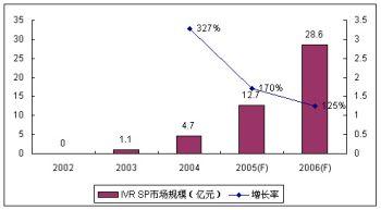 由于運營商的監(jiān)管和增量市場需求的減少,2005年IVR高速增長的勢頭有所回落,市場增長速度趨于理性,SP市場份額增長率為170%,整體SP市場份額達到12.7億元。諾盛預(yù)計2006年IVR市場增長率將繼續(xù)回調(diào),但絕對增長率仍然較快,達到125%。