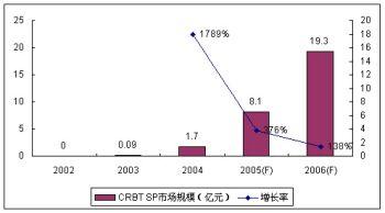 在運營商的大力推動和SP/CP的積極努力下,無線音樂市場從2004年起進入了井噴時期。CRBT業(yè)務(wù)具有的病毒式營銷特性使得CRBT業(yè)務(wù)的滲透率增長迅速,但其時尚特性又使得業(yè)務(wù)的滲透率高峰很容易達到、業(yè)務(wù)縱深有限。2005年,CRBT的SP市場規(guī)模增長率為376%,較上一年的高速增長有所回落。諾盛預(yù)計2006年運營商和SP/CP仍然會力推CRBT業(yè)務(wù)。在產(chǎn)業(yè)鏈積極推動和用戶滲透率高峰已經(jīng)逼近的雙重制約下,諾盛預(yù)計CRBT業(yè)務(wù)的SP市場規(guī)模增長率為138%,整體SP市場規(guī)模達到19.3億元。