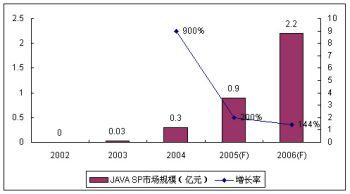 作為SP和移動運營商都非?春玫臉I(yè)務(wù),JAVA業(yè)務(wù)受到眾多SP的青睞。盡管作為JAVA主要業(yè)務(wù)的手機游戲目前盈利狀況普遍欠佳,但空中網(wǎng)、美通無線、數(shù)字魚等SP仍然大量投入,期待著未來業(yè)務(wù)的高速增長。受制于終端和JAVA游戲的表現(xiàn)力,2005年JAVA業(yè)務(wù)的SP市場規(guī)模增長率回落到200%,諾盛預(yù)計2006年JAVA的使用環(huán)境沒有太大變化,其增長率進一步回落至144%。
