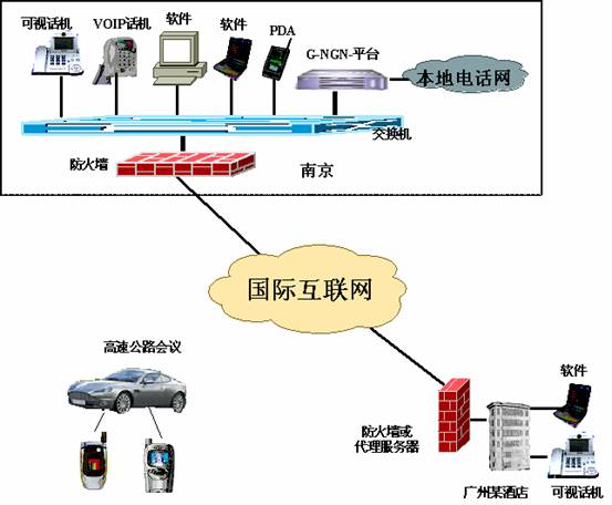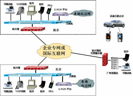 G-NGN-Softswitch產(chǎn)品可以使集團(tuán)用戶通過(guò)租用網(wǎng)絡(luò)運(yùn)營(yíng)商的寬帶線路,或者直接借助國(guó)際互聯(lián)網(wǎng)組建成連接全市、全省乃至全國(guó)的集團(tuán)內(nèi)部網(wǎng)絡(luò)電話,可以提供可視話機(jī)、非可視話機(jī)、客戶端軟件、PDA等多種便捷方式實(shí)現(xiàn)集團(tuán)內(nèi)部的可視或非可視通訊。