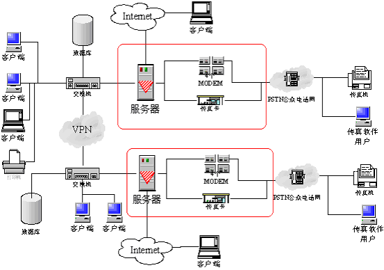上圖中紅色框架為gotoneFax系統(tǒng)。它可以很方便的融入目前企業(yè)的網(wǎng)絡中,擴張您目前網(wǎng)絡的功能,為您提供及時的服務。當然這也是我們的愿望。