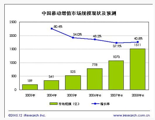 隨著中國(guó)移動(dòng)電話用戶的不斷增長(zhǎng)和移動(dòng)增值服務(wù)的不斷發(fā)展創(chuàng)新,移動(dòng)增值服務(wù)已經(jīng)成為現(xiàn)隨著市場(chǎng)的發(fā)展和不斷規(guī)范,中國(guó)移動(dòng)增值服務(wù)市場(chǎng)將進(jìn)入相對(duì)平穩(wěn)的發(fā)展階段。據(jù)iResearch預(yù)測(cè),中國(guó)移動(dòng)增值服務(wù)的市場(chǎng)規(guī)模增長(zhǎng)速度將逐年減緩,到2008年受奧運(yùn)會(huì)影響增長(zhǎng)速度提高,規(guī)模將突破1500億元。