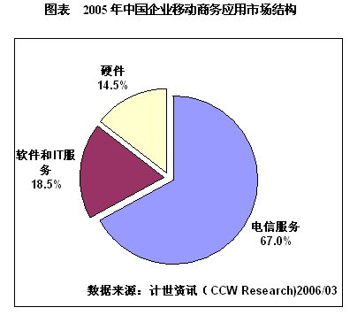 目前,我國移動商務市場仍處于萌芽期,根據計世資訊(CCW Research)《2005-2006中國移動商務應用發(fā)展趨勢研究報告》數據,2005年中國企業(yè)移動商務應用市場規(guī)模為112.5億元,其中硬件投資為16.3億元,軟件與IT服務投資為20.8億元,電信服務投資達到75.4億元,占有整體市場的67.0%。