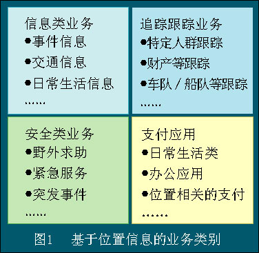 總的來講,基于位置信息的業(yè)務(wù)和應(yīng)用大體上可分為基本信息類業(yè)務(wù)、追蹤/導(dǎo)航類信息業(yè)務(wù)、安全類信息業(yè)務(wù)和與金融相關(guān)的支付類業(yè)務(wù), 如圖1所示。