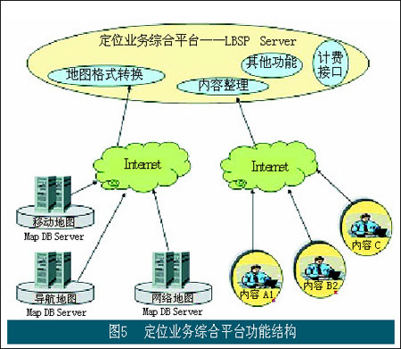 在上述結(jié)構(gòu)中,定位業(yè)務(wù)綜合平臺LBSP扮演著重要角色。其功能結(jié)構(gòu)如圖5所示。在該平臺中提供位置類信息業(yè)務(wù)的業(yè)務(wù)運營支撐功能,包括計費功能(以及和BOSS系統(tǒng)的接口);同時該平臺還扮演著接入不同內(nèi)容開發(fā)商的重要角色。不同的內(nèi)容開發(fā)和提供商通過該平臺向最終用戶提供具體的業(yè)務(wù)和應(yīng)用,運營商通過該平臺對不同內(nèi)容開發(fā)商提供的內(nèi)容進(jìn)行管理和整理,使面向用戶的應(yīng)用能夠順利得到展現(xiàn)。該平臺提供的另一個重要角色是肩負(fù)著接入地圖信息提供商的重任,并在該平臺中通過地圖格式的轉(zhuǎn)換使不同地圖提供商所提供的地圖信息能夠以一致的格式向用戶提供。