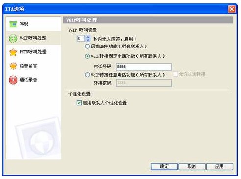 啟動(dòng) VoIP呼叫轉(zhuǎn)接固定電話功能,設(shè)置0秒啟動(dòng),轉(zhuǎn)接固定電話號(hào)碼為交換機(jī)內(nèi)置語(yǔ)音引導(dǎo)號(hào)8888,如圖,假設(shè)8888是交換機(jī)上配置的語(yǔ)音引導(dǎo)號(hào)。