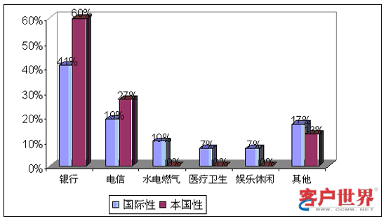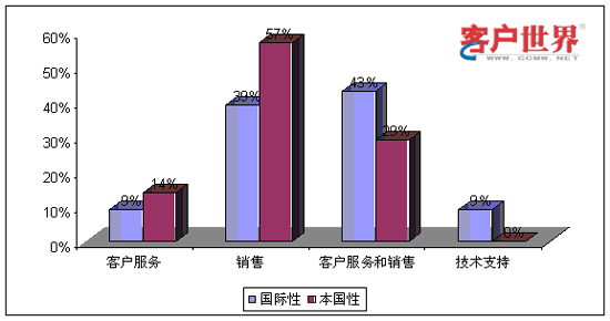 從業(yè)務功能看來,國際性呼叫中心和本國性呼叫中心承擔著不同的角色。9%的國際性呼叫中心和14%的本國性呼叫中心提供僅限于客戶服務,例如賬號查詢和催費收款。39%的國際性呼叫中心和59%的本國性呼叫中心專門展開網上營銷和銷售(外撥為主)。43%的國際性呼叫中心和29%的本國性呼叫中心同時承擔客戶服務和銷售功能。最后,我們調查到9%的國際性呼叫中心專門從事技術支持,而且這些中心專門為國際市場設立。服務功能上的差異會對商業(yè)定位和人力資源管理提出不同的要求。