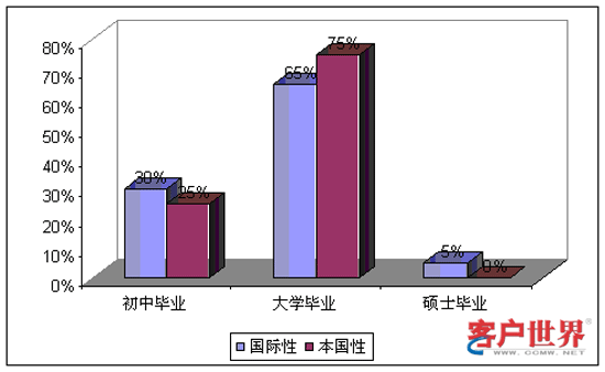 總的而言,參加調研的呼叫中心雇用的員工接受了平均15年的正式教育,也就是大學畢業(yè)的一般水平。國際性和本地型呼叫中心在勞動力的受教育水平上沒有呈現(xiàn)明顯差異。其中,30%的國際性和25%的本國性呼叫中心大量雇用初中畢業(yè)程度(12年教育)的員工;65%的國際性和75%的本國性呼叫中心雇用高中畢業(yè)程度(15年教育)的員工;此外,5%的國際性呼叫中心,往往是提供技術支持服務,主要雇用碩士畢業(yè)水平(17年教育)的員工。