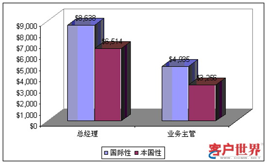 管理人員的薪酬水平明顯高于一線人員的薪酬水平。呼叫中心總經理的年收入達到$8,194,其中在國際性呼叫中心為$8,638而在本地性呼叫中心為$6,514。對于業(yè)務主管來說,平均年工資為$4,253,其中在國際性呼叫中心$4,935而在本地性呼叫中心$3,256。