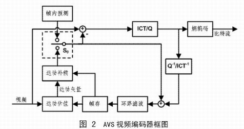 AVS視頻標準定義了I幀、P幀和B幀三種不同類型的圖像,I幀中的宏塊只進行幀內(nèi)預測,P幀和B幀的宏塊則需要進行幀內(nèi)預測或幀間預測,圖中S0是預測模式選擇開關(guān)。預測殘差進行8×8整數(shù)變換(ICT)和量化,然后對量化系數(shù)進行zig-zag掃描(隔行編碼塊使用另一種掃描方式),得到一維排列的量化系數(shù),最后對量化系數(shù)進行熵編碼。AVS視頻標準的變換和量化只需要加減法和移位操作,用16位精度即可完成。