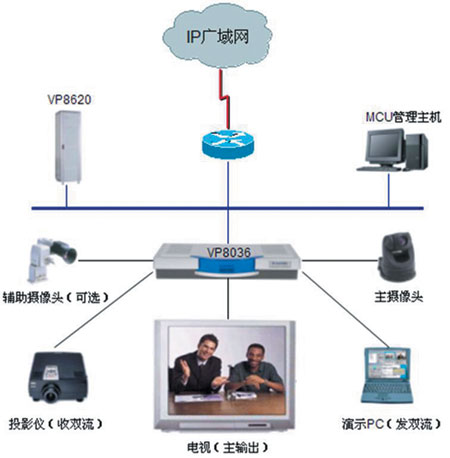 一般我們建議在電視會(huì)議室配置兩臺(tái)帶S-Video端子或者復(fù)合端子的電視機(jī)或者背投,一臺(tái)用于顯示遠(yuǎn)端會(huì)場(chǎng)畫(huà)面,一臺(tái)用于顯示本端會(huì)場(chǎng)畫(huà)面。電視機(jī)尺寸可根據(jù)會(huì)場(chǎng)大小來(lái)選擇。另外我們還建議在會(huì)場(chǎng)布置一臺(tái)高分辨率投影儀,用于顯示雙流畫(huà)面(PC畫(huà)面)。