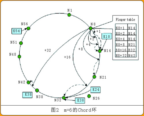 這種查詢機(jī)制只要求節(jié)點(diǎn)知道順時(shí)針方向上自己后面那個(gè)節(jié)點(diǎn)的位置(自己的successor),查詢效率低,花費(fèi)的平均時(shí)間是函數(shù)O(N/2)的值,N是Chord環(huán)的實(shí)際節(jié)點(diǎn)數(shù)。為提高查詢效率,Chord中每個(gè)節(jié)點(diǎn)除了記錄successor和predecessor(順時(shí)針方向上自己前面的那個(gè)節(jié)點(diǎn))外,還要記錄m個(gè)其他節(jié)點(diǎn)。這m個(gè)節(jié)點(diǎn)由successor(n+2i-1)確定,其中n是本節(jié)點(diǎn)的哈希值,i是1到m間的整數(shù)。m個(gè)節(jié)點(diǎn)的集合就是finger表(圖2中給出N8的finger表)。這種方式下查詢資源花費(fèi)的平均時(shí)間為O(logN)。