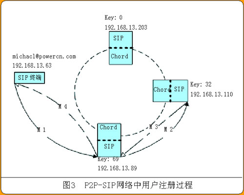 Key值為32的PN收到REGISTER請(qǐng)求后,取得請(qǐng)求中To頭域里的SIP URI(michael@powercn.com),調(diào)用find_responsible_pn(user)。返回值是192.168.13.110:5060,比較后發(fā)現(xiàn)是自己,說明自己負(fù)責(zé)管理該用戶,負(fù)責(zé)處理該用戶的注冊(cè)請(qǐng)求。之后的處理流程遵循SIP標(biāo)準(zhǔn)。假定注冊(cè)成功,PN返回200 OK應(yīng)答。如圖3中M3所示。應(yīng)答的返回遵循SIP標(biāo)準(zhǔn),根據(jù)Via頭域按原路返回,不需要查找路徑,不會(huì)使用Chord層的操作。