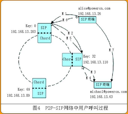 IP地址為192.168.13.26的用戶alice@powercn.com要呼叫用戶michael@powercn.com。alice可以把請(qǐng)求發(fā)給P2P-SIP網(wǎng)絡(luò)中任一PN?紤]到要在P2P-SIP網(wǎng)絡(luò)上提供增值業(yè)務(wù)(比如計(jì)費(fèi)),alice把INVITE請(qǐng)求發(fā)給管理它的PN更合適一點(diǎn),在本例中是IP為192.168.13.203,Key值為0的PN。如圖4中M1所示。