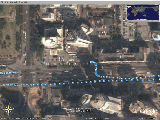 下圖顯示的是在中國(guó)深圳市進(jìn)行汽車試駕時(shí)的GPS數(shù)據(jù),利用的是Google earth應(yīng)用程序。圖中的每一個(gè)藍(lán)點(diǎn)代表一個(gè)GPS讀數(shù)。這些點(diǎn)在每隔一秒的時(shí)間內(nèi)讀出,因此,連續(xù)點(diǎn)之間的距離就代表著汽車的速度。我們甚至可以看見(jiàn)汽車駛?cè)氪髽堑耐\噲?chǎng)。