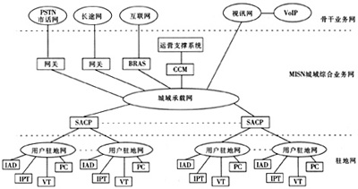 目前,中國(guó)聯(lián)通已建立了覆蓋全國(guó)的成熟的VoIP網(wǎng)、視訊網(wǎng)和互聯(lián)網(wǎng)等骨干業(yè)務(wù)網(wǎng)。為了突破在本地網(wǎng)內(nèi)開(kāi)展業(yè)務(wù)的瓶頸,我們?cè)诔怯蚍秶鷥?nèi)建設(shè)了城域綜合業(yè)務(wù)網(wǎng)(MISN,MetropolitanIntegratedServiceNetwork)。它以現(xiàn)有的城域承載網(wǎng)為基礎(chǔ),通過(guò)先進(jìn)統(tǒng)一的業(yè)務(wù)和網(wǎng)絡(luò)平臺(tái),在城域范圍內(nèi)實(shí)現(xiàn)語(yǔ)音、視頻和因特網(wǎng)等各種業(yè)務(wù)的綜合,將各種業(yè)務(wù)從骨干網(wǎng)向用戶側(cè)延伸。