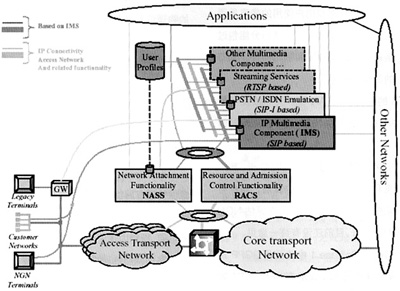 R6中的相關規(guī)范,但要求支持更多的接入方式,包括xDSL、WLAN、LAN、MAN等。此外,還定義了網絡附著子系統(tǒng)和資源準入控制子系統(tǒng)(RACS)。在這樣的框架下,NGN可以實現基于SIP的業(yè)務、基于SIP-I協(xié)議傳統(tǒng)業(yè)務以及基于RTSP的業(yè)務等。ETSI