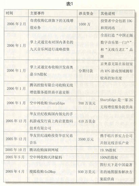 從2003年開(kāi)始,國(guó)內(nèi)就顯現(xiàn)出并購(gòu)增值服務(wù)運(yùn)營(yíng)企業(yè)的苗頭。2004年以來(lái),隨著整治增值服務(wù)運(yùn)營(yíng)企業(yè)的力度不斷加大,并購(gòu)漸成風(fēng)潮(見(jiàn)表1)。2004年2月,新浪收購(gòu)深圳網(wǎng)興科技公司;2004年5月,搜狐收購(gòu)手機(jī)WAP服務(wù)提供商北京吉菲爾公司。2005年,在“超級(jí)女生”節(jié)目大獲成功后,掌上靈通宣布將對(duì)國(guó)內(nèi)著名的九天音樂(lè)網(wǎng)進(jìn)行戰(zhàn)略投資,全面打造“中國(guó)正版數(shù)字音樂(lè)第一門(mén)戶”和“無(wú)線百老匯”品牌。各大移動(dòng)增值業(yè)務(wù)服務(wù)商通過(guò)并購(gòu)競(jìng)爭(zhēng)對(duì)手,門(mén)戶網(wǎng)站可以在移動(dòng)增值服務(wù)領(lǐng)域?qū)で笮碌耐黄,獲得可觀的利益,增強(qiáng)自身的競(jìng)爭(zhēng)力。伴隨著3G商用的日益臨近和市場(chǎng)競(jìng)爭(zhēng)的不斷加劇,主流SP(服務(wù)提供商)進(jìn)一步加快了資本購(gòu)并和業(yè)務(wù)整合的步伐,整個(gè)SP行業(yè)將加速洗牌。經(jīng)過(guò)市場(chǎng)整合,主流SP將不斷做大做強(qiáng),而相當(dāng)多的缺乏市場(chǎng)競(jìng)爭(zhēng)力的SP將被淘汰出局。