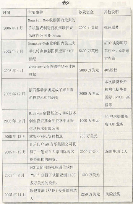 近幾年來(lái),一些資本投資商將投資的重點(diǎn)放到了無(wú)線音樂(lè)、手機(jī)游戲和手機(jī)視訊等業(yè)務(wù)領(lǐng)域,逐步加大了對(duì)SP的投資力度(見(jiàn)表3)。進(jìn)入2005年以來(lái),著眼于2.5G向3G的全面演進(jìn),風(fēng)險(xiǎn)投資對(duì)SP的投資力度進(jìn)一步加大。以滾石移動(dòng)為例,在2002年和2004年獲得兩輪風(fēng)險(xiǎn)投資之后,滾石移動(dòng)憑借在無(wú)線音樂(lè)領(lǐng)域取得的良好市場(chǎng)業(yè)績(jī),又獲得了智基創(chuàng)投、華登國(guó)際、聯(lián)想投資等公司的投資,投資金額達(dá)3000萬(wàn)美元。繼2004年10月獲得IDG投資以后,2005年12月7日,國(guó)內(nèi)著名的數(shù)字音樂(lè)門(mén)戶——A8音樂(lè)集團(tuán)獲得了包括IDG和Intel投資公司在內(nèi)的5家國(guó)際著名投資機(jī)構(gòu)的投資,投資金額達(dá)2000萬(wàn)美元。同月,掌中無(wú)限則獲得了來(lái)自全球性風(fēng)險(xiǎn)投資商BlueRun創(chuàng)投基金和IDG總額達(dá)上千萬(wàn)美元的投資。