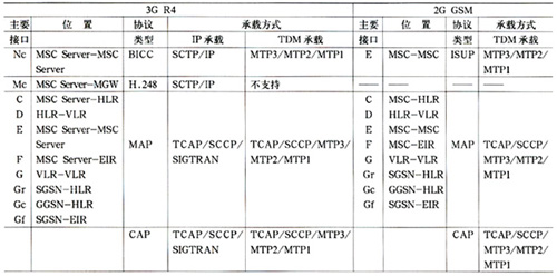 以下首先對3G R4核心網與2G GSM核心網中的主要接口與協(xié)議進行列舉、比較,如表1所示。