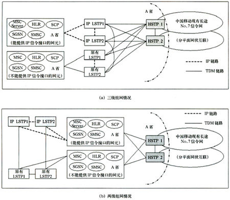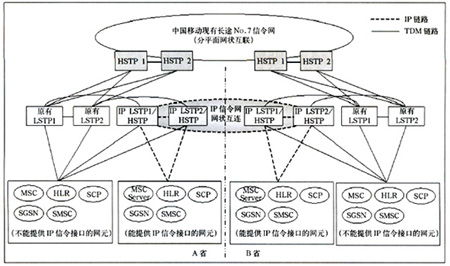 該種方案情況下,省內支持IP信令的網元直接與IP LSTP相連(兩級組網情況下還需要通過TDM方式與現(xiàn)有HSTP相連),不支持IP信令的網元仍保持原有連接方式與現(xiàn)有LSTP相連(兩級組網情況下還要與HSTP)。省際信令消息仍由現(xiàn)有長途No.7信令網疏通,省內信令由LSTP疏通。