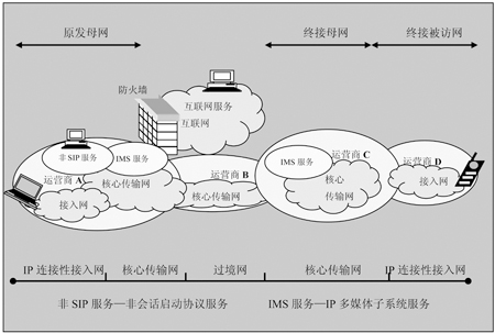 如圖3所示,與一個(gè)被訪問的網(wǎng)不同,IP多媒體子系統(tǒng)還支持母網(wǎng)的概念。在這個(gè)例子中,母網(wǎng)是支持具有登錄權(quán)的IP多媒體子系統(tǒng)的核心網(wǎng)。被訪問的網(wǎng)是當(dāng)前向用戶提供IP多媒體子系統(tǒng)服務(wù)連接的網(wǎng)。圖3中的運(yùn)營商A擁有許多疊接網(wǎng)用戶的母網(wǎng),而運(yùn)營商C擁有移動(dòng)電話的母網(wǎng),而用戶正在運(yùn)營商D的網(wǎng)絡(luò)中漫游。