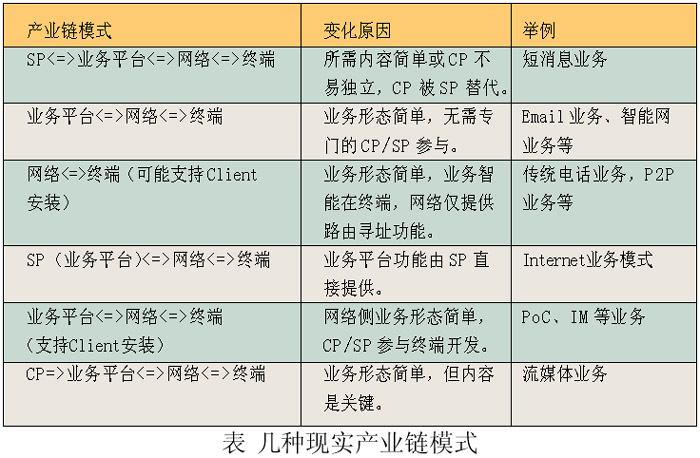CP=> SP< =>業(yè)務(wù)平臺< =>網(wǎng)絡(luò)< =>終端,而現(xiàn)實(shí)中的產(chǎn)業(yè)鏈模式可以通過該模式變化得到,如下表所示。