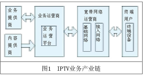 圖1所示的IPTV業(yè)務(wù)產(chǎn)業(yè)鏈中,主要角色包括內(nèi)容提供商/業(yè)務(wù)提供商(CP/SP)、業(yè)務(wù)運(yùn)營商、網(wǎng)絡(luò)運(yùn)營商和終端用戶。業(yè)務(wù)運(yùn)營商具有IPTV業(yè)務(wù)運(yùn)營資質(zhì),通過業(yè)務(wù)運(yùn)營平臺保證業(yè)務(wù)的提供和管理運(yùn)營,起著業(yè)務(wù)主導(dǎo)的作用;內(nèi)容提供商為業(yè)務(wù)運(yùn)營商提供內(nèi)容,業(yè)務(wù)提供商向業(yè)務(wù)運(yùn)營商提供增值業(yè)務(wù),使得業(yè)務(wù)中的內(nèi)容和種類豐富多彩以滿足用戶的不同需求,內(nèi)容提供商和業(yè)務(wù)提供商一般能根據(jù)用戶的使用情況獲取收入分成;
