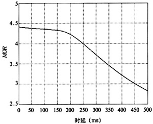 對實(shí)時的語音和視頻業(yè)務(wù)來說,業(yè)務(wù)數(shù)據(jù)端到端的時延最為關(guān)鍵,從仿真結(jié)果圖6和圖7可以看出時延對R系數(shù)和MOS值的影響:隨著時延的增加,R系數(shù)和MOS值都降低,即語音質(zhì)量變差。當(dāng)時延大于150ms時,語音質(zhì)量下降的比較厲害。