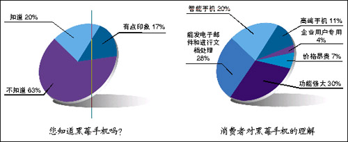 根據(jù)調查結果,目前國內知道黑莓手機的消費者僅占20%,有63%的消費者從沒有聽說過“黑莓”這個名字,還有17%的消費者只是有點印象。
