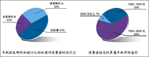 另一個調查項目展現(xiàn)了這個問題的另一面。調查顯示,只有28%的消費者知道黑莓手機的核心功能是郵件的Push功能和在線文件處理。并且,在這些人中,83%的人認為這個功能的收費令他們無法接受。