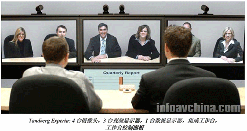 MXP信號編解碼器、4臺高分辨率攝像頭和3臺50英寸的等離子顯示器,用戶播放視頻內(nèi)容,1臺50英寸等離子顯示器安放在中央視頻顯示屏幕下方,顯示數(shù)據(jù)信息。同時,Experia系統(tǒng)還包括了遠程呈現(xiàn)控制臺,為用戶提供了三種木制造型選擇,控制臺上的3臺麥克風(fēng)構(gòu)成了音頻系統(tǒng)。系統(tǒng)每通信站點支持6位與會者參與會議。與其它遠程呈現(xiàn)系統(tǒng)一樣,Experia在聲音和圖像方面的性能非常出色,系統(tǒng)使用簡單、穩(wěn)定可靠。泰德的遠程呈現(xiàn)系統(tǒng)雖然采用與寶利通類似的H.323/SIP標(biāo)準(zhǔn),在系統(tǒng)與業(yè)界標(biāo)準(zhǔn)的協(xié)同工作以及用戶之間互聯(lián)互通的性能方便似乎更勝一籌。