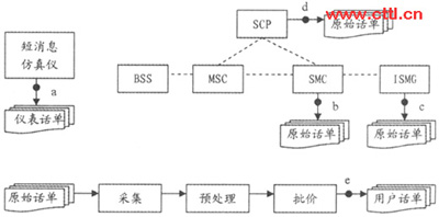 通過對移動點(diǎn)對點(diǎn)短消息計(jì)費(fèi)原理的分析,可以把整個(gè)計(jì)費(fèi)過程劃分為兩大環(huán)節(jié):計(jì)費(fèi)點(diǎn)原始話單的生成和后期計(jì)費(fèi)處理系統(tǒng)的處理。如果其中任何一個(gè)環(huán)節(jié)出現(xiàn)差錯(cuò)都會降低用戶計(jì)費(fèi)話單的準(zhǔn)確性。因此在測試過程中采取了用戶層面和設(shè)備層面相結(jié)合的方法:一方面使用仿真儀表大量模擬點(diǎn)對點(diǎn)短消息的發(fā)送和接收,得到用戶話單;一方面分析各個(gè)計(jì)費(fèi)點(diǎn)生成的原始話單。