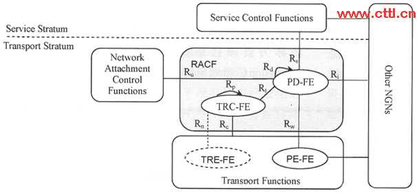 RACF由策略決策功能實體PD-FE和傳送資源控制功能TRC-FE兩個功能實體組成。PD-FE基于網(wǎng)絡策略規(guī)則、業(yè)務控制功能SCF提供的業(yè)務信息、網(wǎng)絡附著控制功能NACF提供的傳送層簽約信息,以及TRC-FE提供的資源接納決策結(jié)果,做出網(wǎng)絡資源接納控制的最后決策?梢曰诿總流對傳送層的策略執(zhí)行功能實體。PE-FE下發(fā)資源接納控制策略。TRC-FE負責收集和維護傳送網(wǎng)的拓撲和資源狀態(tài)信息,基于拓撲、連接性、網(wǎng)絡、節(jié)點資源的可用性以及接入網(wǎng)中的傳送層簽約信息等網(wǎng)絡信息控制資源的使用,提供傳送網(wǎng)絡接納控制的決策。PD-FE通過Rt參考點請求TRC-FE檢測或者決定所請求的媒體流路徑上的QoS資源。