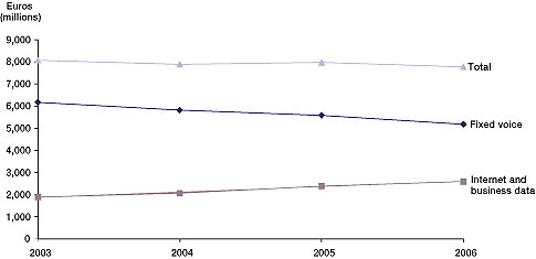 但問題是,在發(fā)達(dá)國家,用戶寬帶接入市場已經(jīng)接近飽和。正因為是這樣一種情況,所以用戶數(shù)量也就很難再有增加。ARPU值在極大的競爭壓力下也很難有很大的突破。一切都靜止不動,固話收入持續(xù)下降,所以圖中的“'Internet