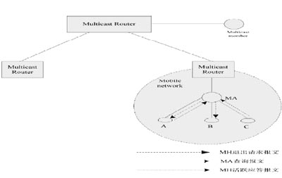 host,簡(jiǎn)稱(chēng)MH)在一個(gè)子網(wǎng)中,如果要加入某個(gè)組播組,就向當(dāng)?shù)刈泳W(wǎng)的MA發(fā)送一個(gè)加入請(qǐng)求,在MA向組播路由器發(fā)送加入組播組的請(qǐng)求后,通過(guò)組播路由協(xié)議建立到該MA的組播樹(shù)。