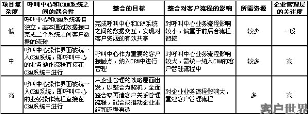 表一:呼叫中心和CRM整合項(xiàng)目的分類