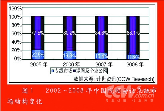 從市場(chǎng)結(jié)構(gòu)上看,混網(wǎng)及Internet軟件視頻會(huì)議系統(tǒng)市場(chǎng)已經(jīng)形成了對(duì)專(zhuān)線(xiàn)市場(chǎng)的主導(dǎo)地位的挑戰(zhàn),僅2004年,專(zhuān)線(xiàn)市場(chǎng)就比2003年下降了19.5個(gè)百分點(diǎn),到2005年混網(wǎng)及企業(yè)公網(wǎng)市場(chǎng)份額達(dá)到77.5%,而在2006年,混網(wǎng)及Internet視頻會(huì)議系統(tǒng)已經(jīng)達(dá)到80.2%的市場(chǎng)占有率,基本占據(jù)了市場(chǎng)的主導(dǎo)地位。
