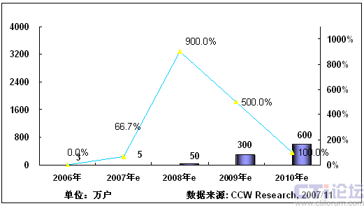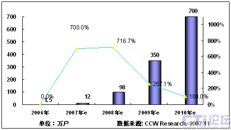2008年,隨著3G在中國商用,以及奧運帶來豐富視頻內容,將推動手機電視作為一項重要的移動增值業(yè)務將進入市場發(fā)展期;同時隨著網絡、終端、內容、商業(yè)模式等因素的發(fā)展,產業(yè)鏈初步完善,看好手機電視業(yè)務的產業(yè)鏈各環(huán)節(jié)大力介入,北京奧運會將大大激發(fā)用戶使用手機電視業(yè)務的熱情,從而推動手機電視進入快速發(fā)展階段。根據計世資訊預計,2008年中國手機電視用戶將達到400萬。